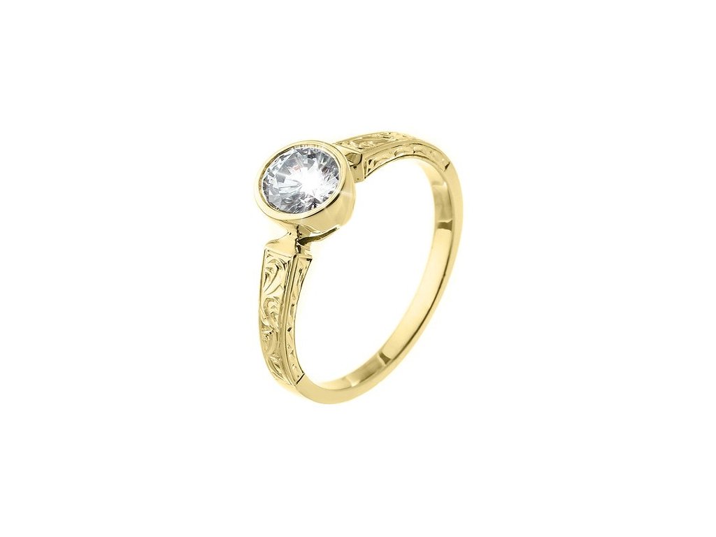 Zásnubní prsten ze žlutého 14karátového zlata spojuje nadčasovou klasiku s mistrovským řemeslným zpracováním. Zaujme bohatým zdobením vytvořeným tradičními zlatnickými technikami. Ručně rytý ornament podtrhuje krásu a třpyt přírodního diamantu.