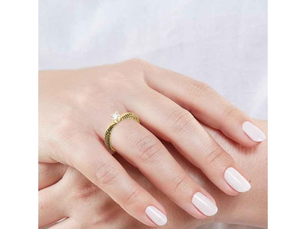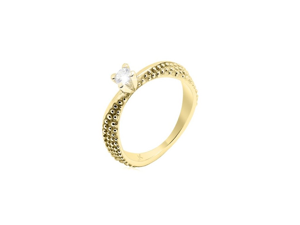 Zářivý přírodní diamant zasazený do 14karátového žlutého zlata tvoří s tečkovaným povrchem neodolatelně hravý a zároveň sofistikovaný celek. Design evokuje eleganci inspirovanou tradicí a přináší originální vzhled, který zaujme na první pohled. Vhodný pro ženu, která ocení kvalitu a styl.