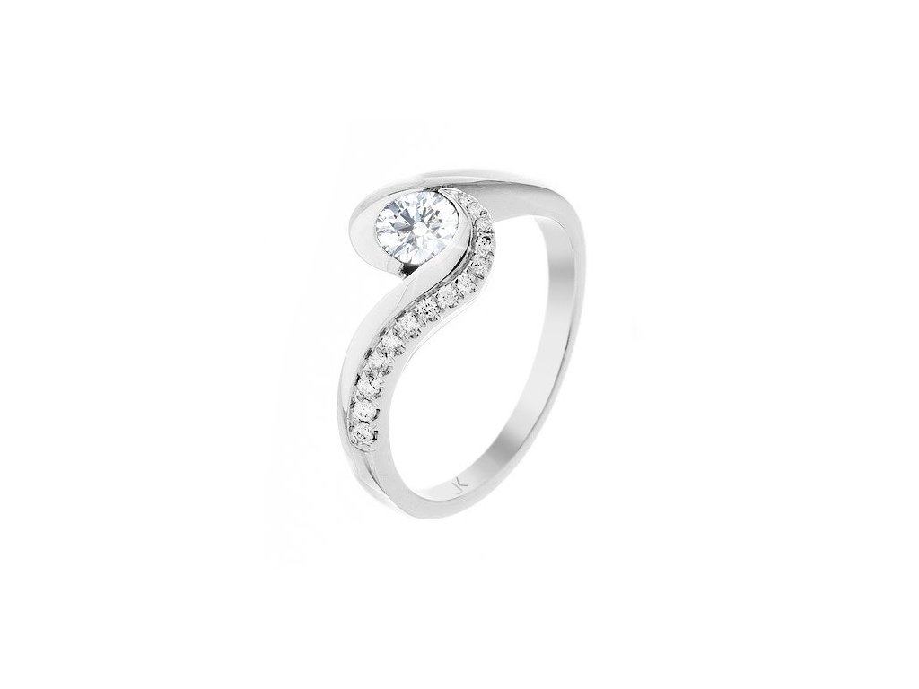 Jedinečný zásnubní prsten z 14karátového bílého zlata s centrálním přírodním diamantem, který je elegantně objímán křivkou vykládanou drobnými diamanty. Tvar prstenu symbolizuje nekonečno a věrnost. Tento sofistikovaný šperk je dokonalým vyjádřením hlubokého citu a odhodlání. Skvělá volba pro ženu, která miluje moderní eleganci a jemný třpyt přírodních diamantů.