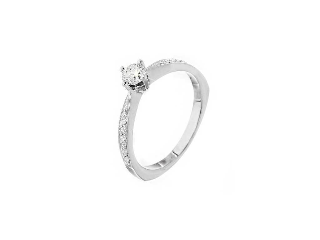 Elegantní prsten z bílého 14karátového zlata zdobí přírodní diamant. Linii prstenu zdobí ručně osazené brilianty, které mu dodávají půvabný třpyt. Zajímavé zkosení prstenu přidává šperku charakteristickou eleganci a podtrhuje jeho nadčasová design.