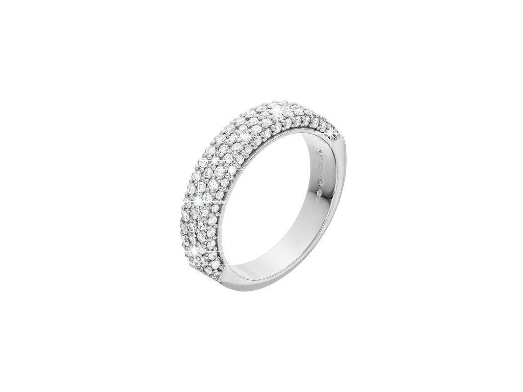 Prsten z bílého 14karátového zlata zdobený přírodními diamanty okouzlí bohatým třpytem. Diamanty ručně osazené v několika řadách zachycují světlo a vytvářejí tak výjimečně luxusní šperk.