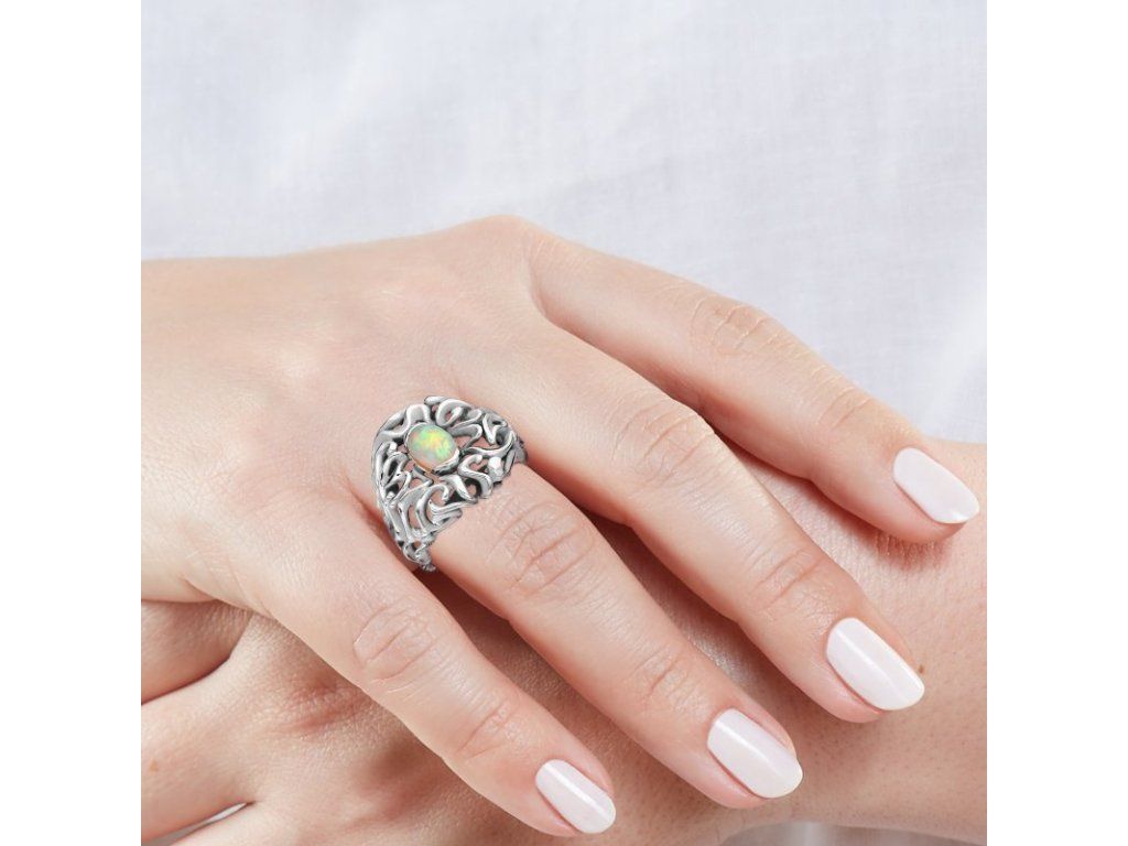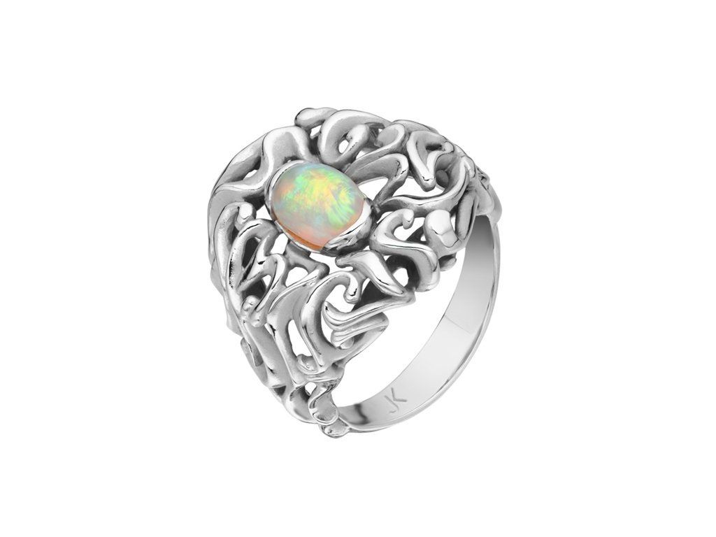 Prsten ze 14karátového bílého zlata zdobí přírodní opál. Kámen, který se s každým pohybem ruky proměňuje a odhaluje svou magickou hru barev. Propletené linie zlata jej něžně objímají a podtrhují jedinečnou barevnost tohoto výjimečného drahokamu.