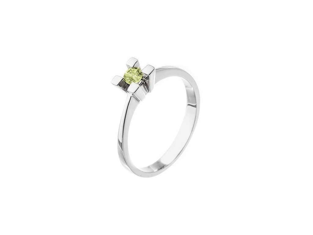 Zásnubní prsten z bílého 14karátového s přírodním zeleným peridotem. Geometrická korunka umožňuje maximální průchod světla pro intenzivní třpyt a dokonale vyvážený vzhled. Prsten v sobě nese harmonii mezi klasickou krásou drahého kamene a novodobým designem, který si zamilujete.