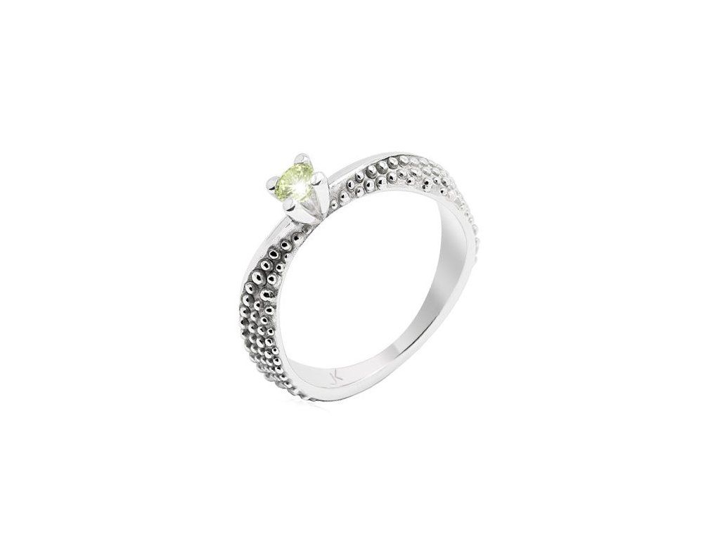 Jemný prsten z bílého 14karátového zlata zdobí drobné zlaté kuličky. Peridot je zasazen v otevřené korunce, aby mohl volně zachytávat světlo a rozzářit se svou svěží zelení.