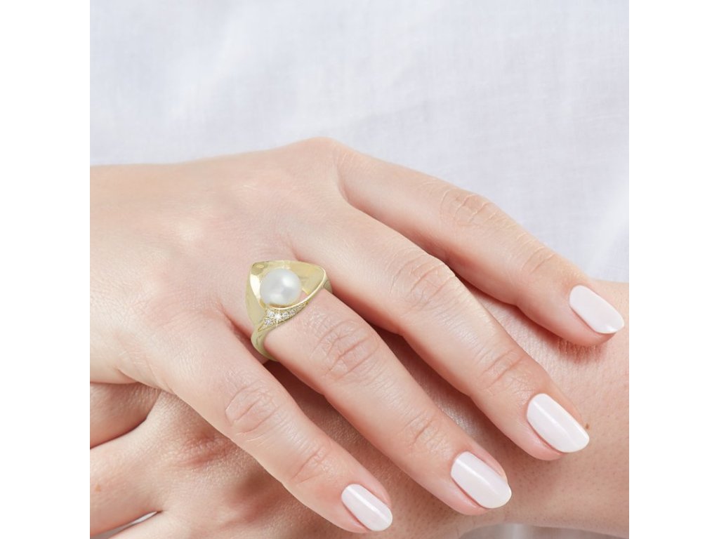 Prsten ze žlutého 14karátového zlata s bílou sladkovodní perlou má organický, plynulý tvar. Křivky zlata elegantně obtáčejí perlu, jako by ji objímala samotná příroda.