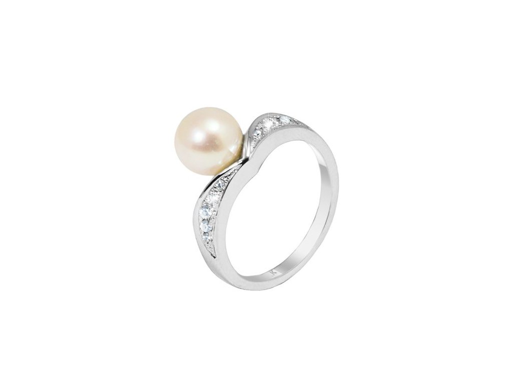 Prsten z bílého 14karátového zlata zdobí jemná sladkovodní perla, která na světle září čistou elegancí. Přírodní diamanty v linii prstenu zvýrazňují její přirozený půvab a dodávají šperku jemný třpyt.