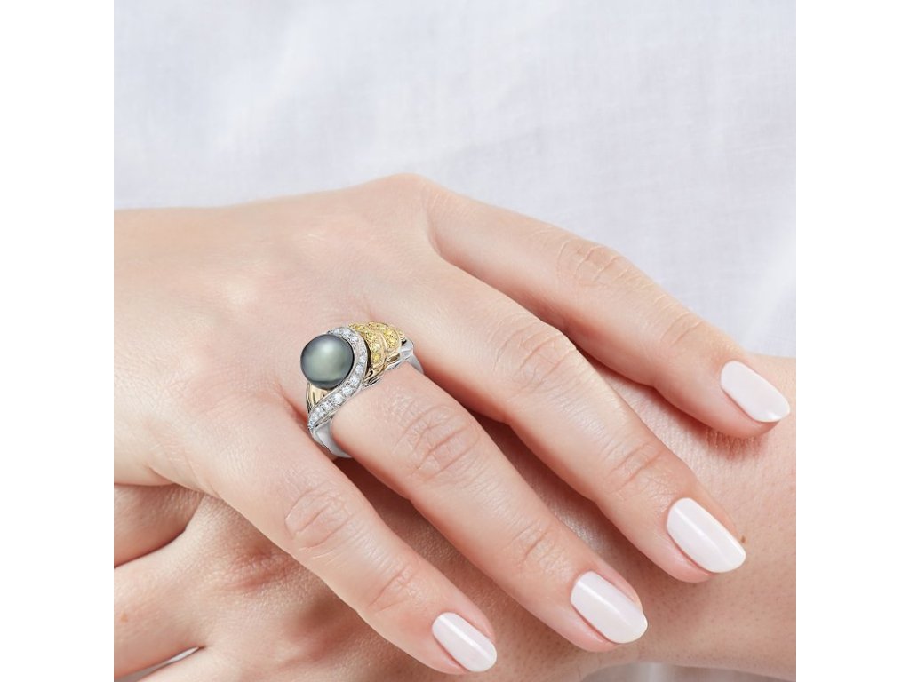 Luxusní prsten z bílého a žlutého 18karátového zlata. Uprostřed září tahitská perla s kovovým leskem, obklopená vlnami čirých a žlutých přírodních briliantů. Kombinace dvoubarevného zlata, lesku diamantů a duhového povrchu perly vytváří harmonii elegance a originality.