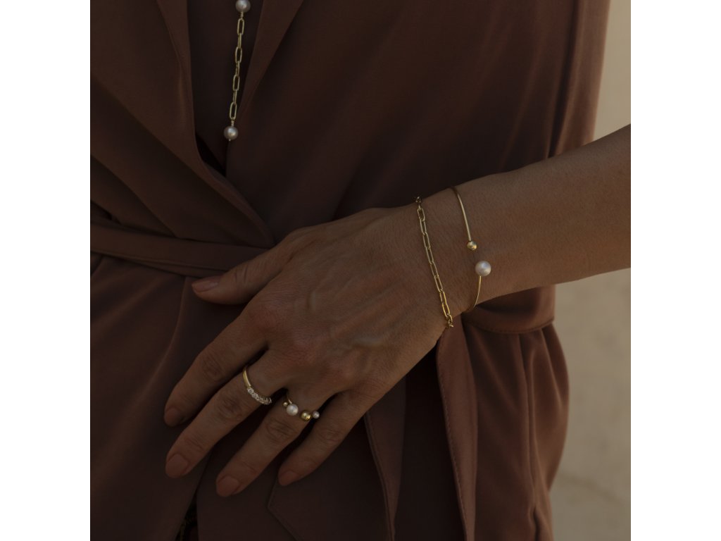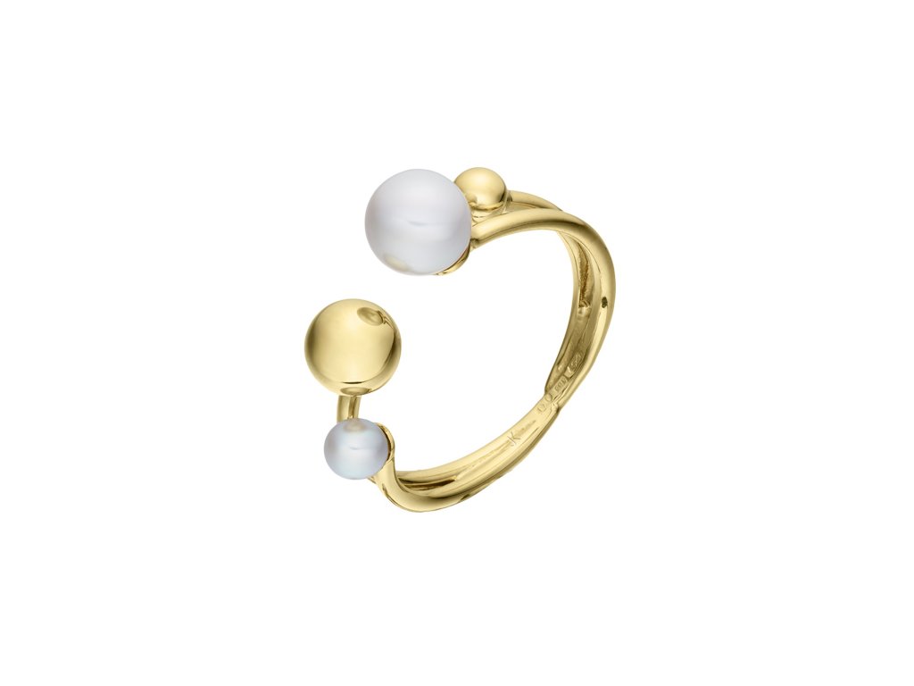 Prsten ze žlutého 14karátového zlata zaujme svým svěžím designem. Dvojice hladkých, paralelních linií s volným zakončením je ozdobena zlatými, lesklými kuličkami a dvojicí bílých sladkovodních perel, které se pravidelně střídají a vytvářejí harmonický celek.