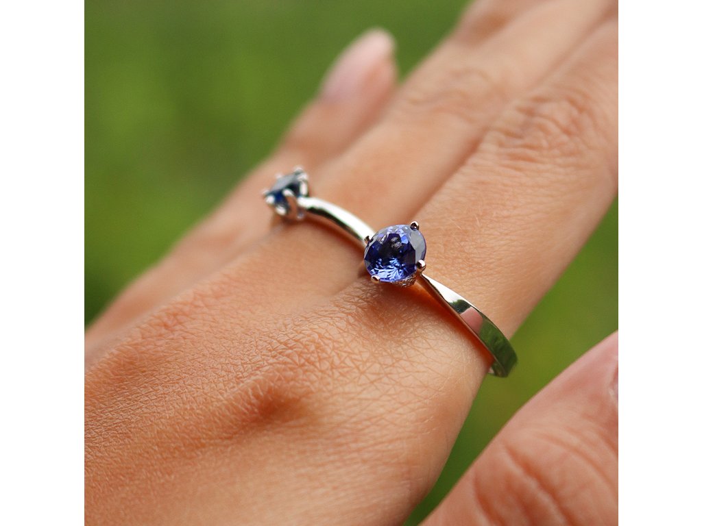 Prsten z bílého 14karátového zlata zdobí tanzanit v jedinečném modrofialovém odstínu. Jeho fascinující barva se mění s dopadem světla a působí tajemně a noblesně. Osm drobných diamantů kolem podtrhuje jeho hloubku a dodává prstenu zářivý třpyt. Trojúhelníkový profil šíny dodává prstenu osobitý charakter a zároveň zajišťuje pohodlné nošení.