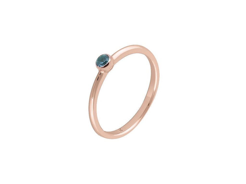 Prsten z růžového 14karátového zlata zdobí přírodní topaz Swiss, jehož modrá barva přitahuje pohled na první pohled.