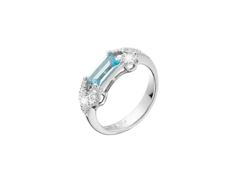 Prsten z bílého 14karátového zlata zdobí přírodní topaz Swiss, který okouzlí svou modrou barvou a průhledností. Drahokam je precizně zasazen do elegantní korunky, kterou zdobí přírodní čiré diamanty, které dávají celému prstenu kouzelný třpyt.
